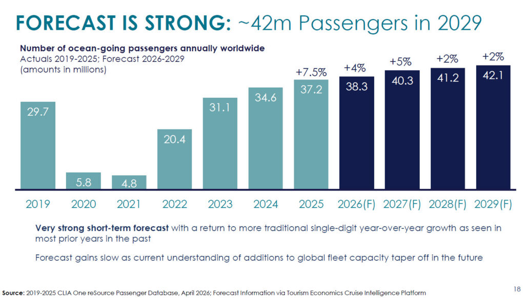 - 38.3 million cruises passengers expected to sail in 2026 (21.7 million are expected to be American)